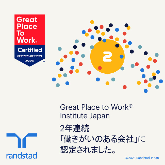 総合人材サービスを提供するランスタッド株式会社(本社:東京都千代田区 代表取締役会長兼CEO ポール・デュプイ)はこの度 Great Place to Work(R) Institute Japan(以下GPTW)より2年連続「働きがいのある会社」に認定されたことをお知らせいたします。働く人へのアンケート結果を基に、優れた職場文化に基づいた「働きがいのある会社」であることをGPTWが正式に認定したもので10月2日にGPTWのホームページで公開される予定です。ランスタッドは「人々のキャリアライフに寄り添うことで、より多くの人の真の可能性を引き出すこと」を会社の目的としており、今後も世界を代表する総合グローバル人材サービス企業として、働くことや人々のキャリアに関わる全てをサポートしてまいります。
