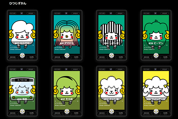 トレカ型NFTなので、コレクションを楽しめる作品にしたいと思いました。「ひつじずかん」は色々なひつじが登場するカードですが、背景の色も少しずつ変えて被らないようにしています。お気に入りのひつじを見つけてもらえたら嬉しいです。