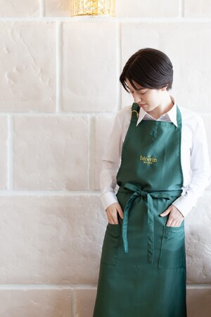 ブランドカラーのグリーンが鮮やかな素材は、心地よい滑らかな肌触りに仕上げました。ビブエプロンと呼ばれる胸当てタイプと折り畳んで使うことでカフェ仕様のギャルソンエプロン(前掛け)の2WAY対応の利用ができます。当商品は、Bicerin各店舗のカフェでテーブルクロスに使用していた撥水加工の生地をアップサイクルしエプロンとして生まれ変わりました。
