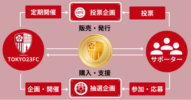 TOKYO23FCのトークンは”TOKYO23FCトークン”としてFiNANCiE上で発行されます。トークンを購入いただいた方々は、運営の一部に携われる投票企画への参加や特典抽選などへ応募いただくことができます。