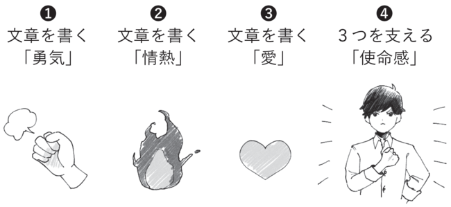 (1. 文章を書く「勇気」 2. 文章を書く「情熱」 3. 文章を書く「愛」 4. 3つを支える「使命感」)