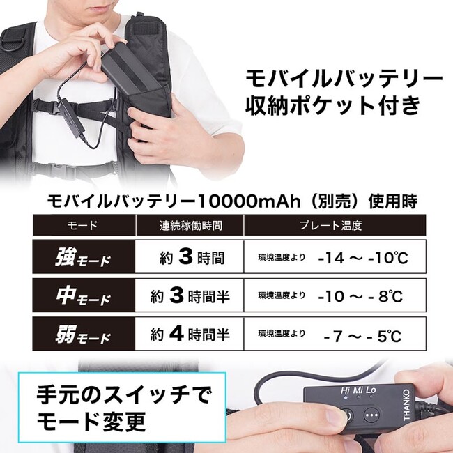 電源はお手持ちのモバイルバッテリーが使えるUSB給電方式。小型冷蔵庫などに搭載されるペルチェ冷却システムを採用。電源を入れると背中左右に搭載された冷却プレートが環境温度から約-14度に冷えて冷却。暑い夏でも快適に過ごすことが可能です。手元のリモコンで弱中強の3段階切り替えが可能。10000mAhのモバイルバッテリー使用時で最大4.5時間稼働(弱モード時)します。モバイルバッテリーは前側のポケットに収納可能。M〜3L(胸囲160cm)まで対応。ベルトでしっかりと締められるのでフィット感の調整が可能。冷却ユニット部分を取り外して洗濯機で洗濯が可能。いつでも清潔にお使いいただけます。墜落制止用器具ハーネスに対応。ファン付ウェアの中に本製品を着て使用も可能です。