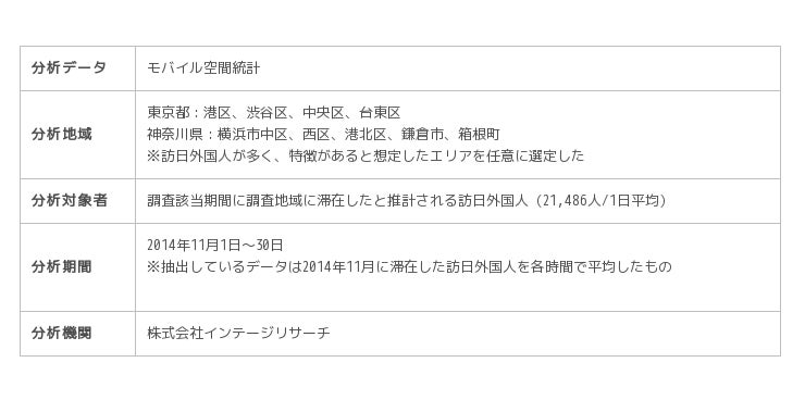 本分析は、2014年11月に訪日した外国人の滞在場所を、居住国別、時間帯別に分析地域ごとにまとめたものです。