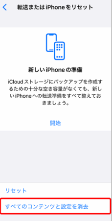 Step3:「すべてのコンテンツと設定を消去」を選択します。
