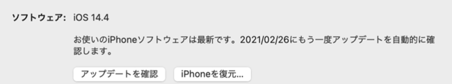 iTunesへ接続出来たら、iTunesウィンドウの左上にiPhoneのマークをが表示されます。そこからiPhoneの画面へ進むと以下のように「アップデート」と「iPhone復元」の選択肢が表示されます。