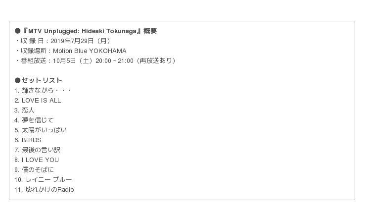 米国バイアコム社傘下のバイアコム・ネットワークス・ジャパン株式会社(所在地:東京都港区、代表取締役社長:井股 進)が運営する世界最大級のユース向け音楽&エンターテインメント・チャンネル「MTV」は、徳永英明を迎え、伝統のアコースティックライブ「MTV Unplugged」を2019年7月29日(月)にMotion Blue YOKOHAMAにて収録いたしました。
