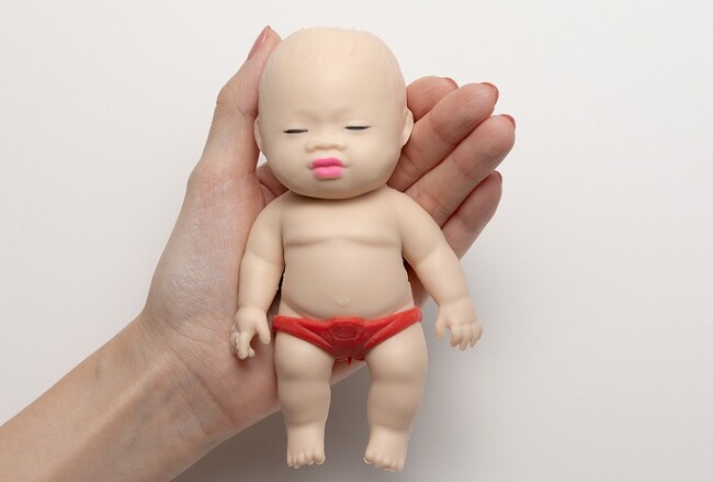 赤ちゃんの形をした柔らかく弾力のある触り心地のよいおもちゃ「赤ちゃんスクイーズ」。こちらの認知と利用意向を調査しました。