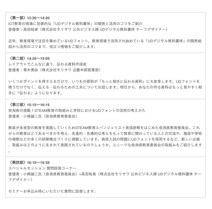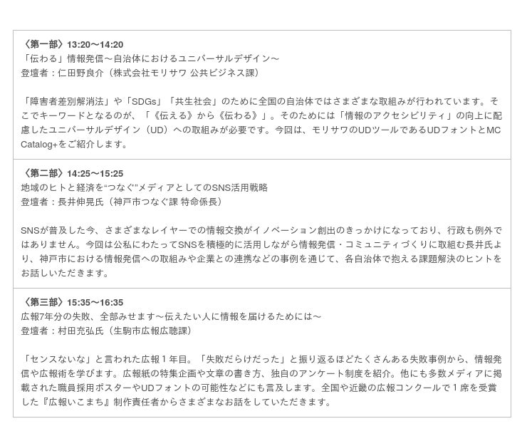 合理的配慮やユニバーサルデザインの観点から、広報や情報伝達、教育について改めて考えるセミナーです。先進的な取組みを行っている自治体担当者の体験談だけでなく、モリサワ社員から「相手に伝わる」ための文字の使い方やデザインについてもご説明します。