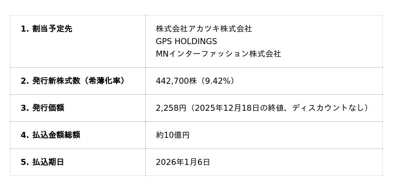 複数のアパレルブランドを展開する株式会社yutori(本社 : 東京都世田谷区 / 代表取締役社長 : 片石 貴展 / 東証グロース市場:証券コード5892 / 以下 yutori社)は、2025年12月19日付の取締役会において、下記のとおり、株式会社アカツキ(以下「アカツキ社」といいます。)、株式会社GPS HOLDINGS(以下「GPS HD社」といいます。)及びMNインターファッション株式会社(以下「MNIF社」といい、アカツキ社、GPS HD社及びMNIF社を個別に又は総称して「本業務提携先」といいます。)に対して第三者割当による新株式の発行を行うこと、併せて本業務提携先との間で資本業務提携契約を締結し、資本業務提携(以下「本資本業務提携 」といいます。)を行うことについて決議いたしましたので、お知らせいたします。