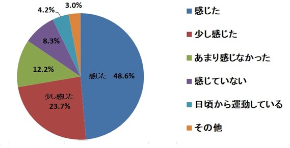 アンケートの回答で特に気になったキーワードは「運動不足」でしょうか。7割を超える人が「運動不足」を感じながら「やってみて良かった」との回答は約1割にとどまり、2割強が「体を動かす時間を大切にしたい」と答えています。