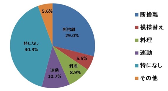 「特になし」がトップで、全体の4割を占めました。次いで、捨てられずに溜まってしまった家財などを整理する「断捨離」が3割近く。「運動」「料理」「模様替え」がこれに続きました。
