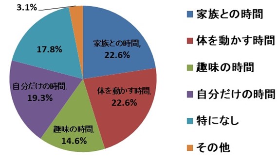 飛び抜けて高い比率の回答はありませんでしたが、「家族との時間」「体を動かす時間」「趣味の時間「自分だけの時間」といった回答が得られました。