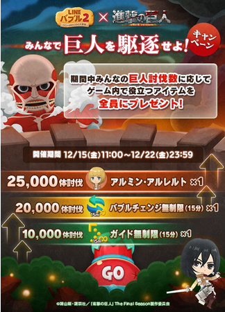 「LINE バブル2」のゲーム内イベント、アタックザボスイベント開催を記念して、みんなの巨人討伐体数に応じてゲーム内で役立つアイテムを全員にプレゼントします。