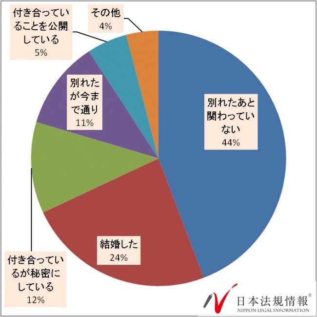 「別れた後関わっていない」との回答者が44%、「結婚した」との回答者が24%、「付き合っているが秘密にしている」との回答者が12%、「別れたが今まで通り」との回答者が11%、「付き合っていることを公開している」との回答者が5%、「その他」との回答者が4%でした。付き合っていても秘密にする人の方が多くいました。職場恋愛を経て24%の人が結婚する一方で、別れた後に関わらないと回答した人が44%となる結果となりました。