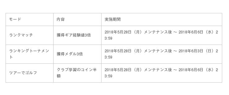 対象期間中、「ランクマッチ」プレイ時に獲得するギア経験値および「ランキングトーナメント」をプレイ時に獲得するメダルが3倍、「ツアーでゴルフ」のクラブ学習時に必要なコインが半額になります。