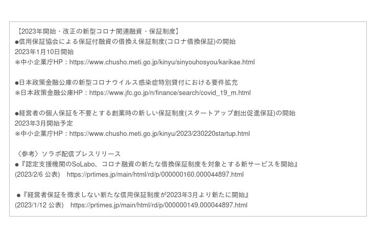 2023年に入り、既に新型コロナ関連の融資制度の変更や新たな保証制度が開始され、また今後導入予定のものも発表されています。