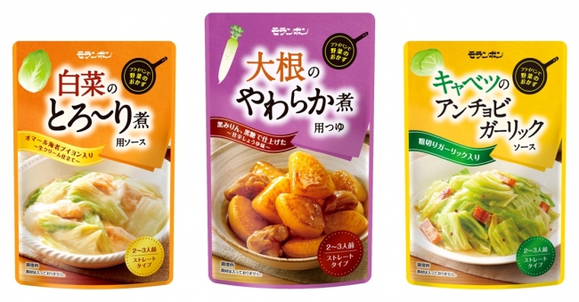 青果売場向け商品として、主婦の献立の悩みを解決する「白菜のとろーり煮用ソース」をリニューアル発売、「大根のやわらか煮用つゆ」「キャベツのアンチョビガーリックソース」を新発売いたします。