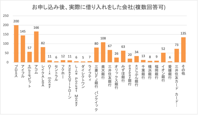 お申し込み後、実際に借り入れをした会社はプロミスが最も多く、200人が実際に借入を行いました。