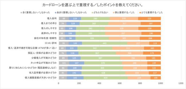 カードローンを重視する/したポイントとして、借入・返済のしやすさや借入の早さ、金利を重視していていることがわかりました。