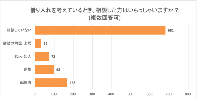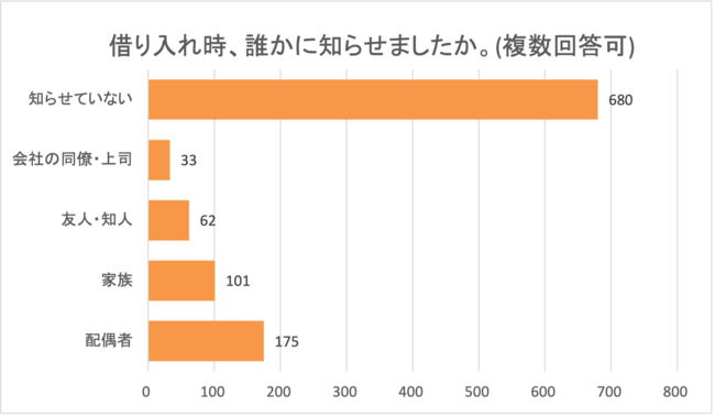「借り入れ後、誰かに知らせましたか。」という問いに対し、「知らせていない」と回答した人は680人いました。