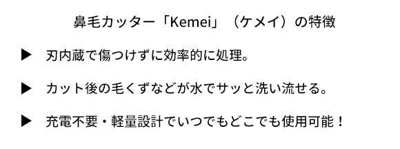 そんな時に持っていると便利なのが、優れた切削力を誇る鼻毛カッター「Kemei」です。