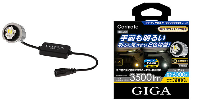 株式会社カーメイト(本社:東京都豊島区)は、自動車用ライトブランド「GIGA(ギガ)」より、純正LEDバルブから交換するLEDフォグバルブ「GIGA LEDフォグバルブ S3500GSD」を8月23日(水)に発売いたしました。白色光/黄色光の2色切り替えモデルで、バルブとドライバーユニットを別体型にすることで従来品比1.25倍※の明るさとなりました。詳細は以下をご覧ください。