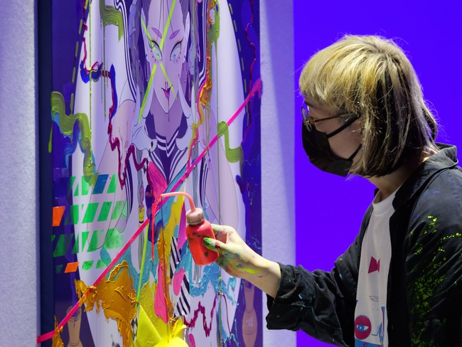 「FORTNITE」のローディング画面などを手掛ける世界的アーティスト「MITSUME」が、出現画廊のために実施したオリジナルライブペイントの特別映像を放映。スタイリッシュかつ目を引く大胆なパフォーマンスでサイネージを素敵に彩ります。