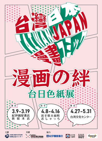 台北駐日経済文化代表処台湾文化センター主催、公益財団法人日本台湾交流協会共催にて、2023年3月9日(木)より、紀伊國屋書店新宿本店、岩手県大槌町文化交流センターおしゃっち、台湾文化センターの3カ所にて、日台漫画家が描いた日本・台湾双方向への感謝を表現したオリジナル色紙228枚を展示する『漫画の絆 台日色紙展』巡回展を開催します。また、3月9日(木)AM10:00より、紀伊國屋書店新宿本店1階催事スペース 「THE ENTRANCE」にて開幕式を実施いたします。