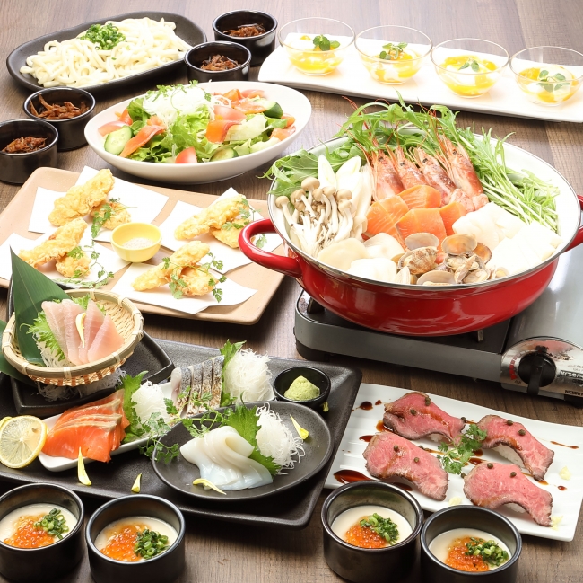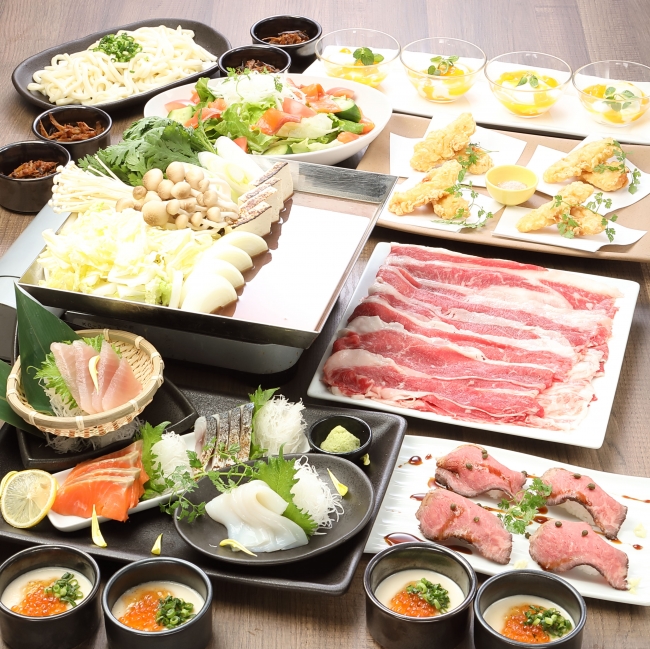 ・コース内容:「国産牛のすき焼き」もしくは「豪華海鮮ちゃんこ鍋」どちらかのメインを含めた全9品