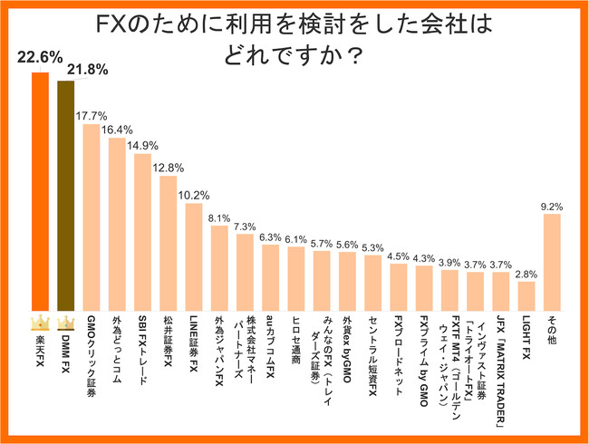 口座開設を検討した会社はDMM FXが最も多く、218人(21.8%)が検討していました。