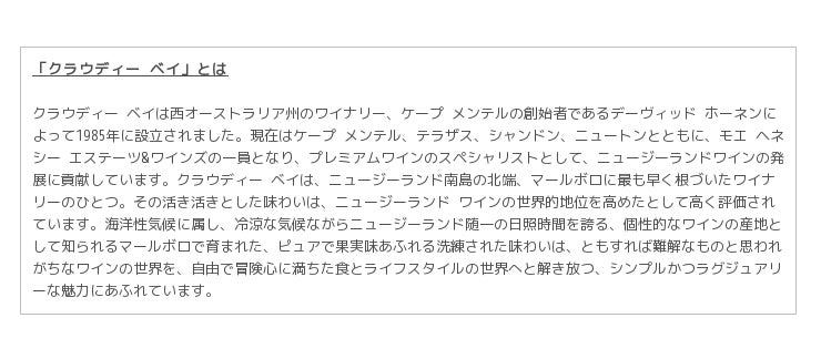 収穫後、フリーランジュースは48〜72時間冷却させ、その後澱引きを行いました。発酵は培養酵母および天然酵母を用いて主にステンレスタンクで施し、さらに約3%はフレンチオークの旧樽と大樽にて高めの温度で発酵させました。「クラウディー ベイ」のソーヴィニヨン ブランは、優れたバッチのワインのみを選んで極めて慎重にブレンディングを行っています。 アルコール度数:13.3% pH:3.05 総酸:7.3g/L