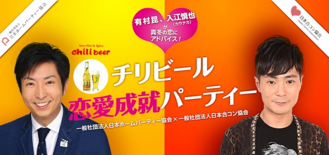 今回のパーティーは、これからの寒い冬を乗り切る「ホットな恋愛成就のビールパーティー」として、ゲストに一般社団法人日本ホームパーティー協会のアンバサダー、有村昆さん。一般社団法人日本合コン協会の名誉合コンマスターの入江慎也(カラテカ)さんを招き、参加者とともに「チリビール」と恋愛トークを楽しむイベントとなります。