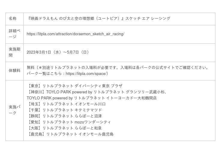 遊びが学びに変わる次世代型テーマパーク「リトルプラネット」(https://litpla.com)を全国に展開する株式会社リトプラ(本社:東京都港区、代表取締役CEO:後藤 貴史)は、3月1日(水)から5月7日(日)までの期間限定で、全国9か所の「リトルプラネット」に『映画ドラえもん のび太と空の理想郷(ユートピア)』をイメージしたデジタルアトラクションが登場することをお知らせいたします。