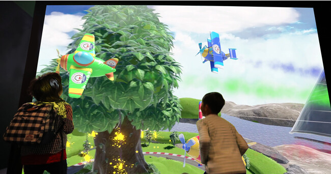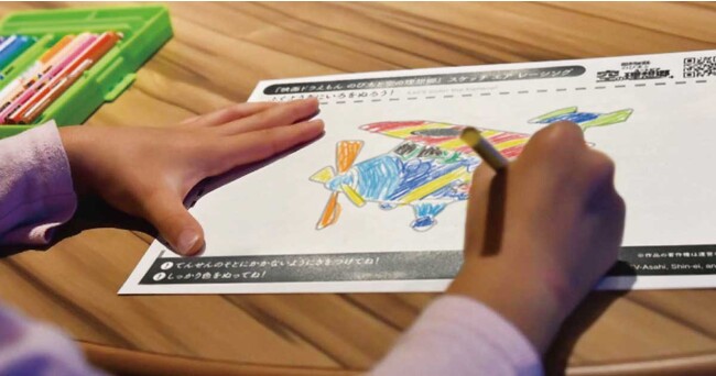 色鉛筆で飛行機の色や形を自由にデザインして専用のスキャナーで読み取ると、『映画ドラえもん のび太と空の理想郷(ユートピア)』のデザインを使用したエンブレムが貼られた(※)“世界に一つだけの飛行機”がスクリーンの中で3Dアニメーションとなって登場し、大空を舞台に白熱のエアレースを繰り広げます。