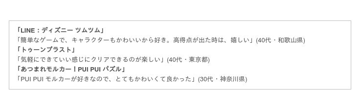 「時間がある時に、クイズやパズルをしたりして、暇つぶしになる。ポイントが入るものもあり嬉しい」(40代・和歌山県)、「ゲーム内に推しキャラを見つけて推し活をしていて、毎日楽しい」(30代・新潟県)などポジティブな意見がある一方、「うまくいかないとストレスがたまる」(20代・北海道)、「はまってしまい寝不足になった」(30代・福岡県)という声も。