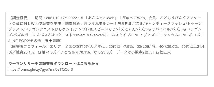 園児とママの情報誌「あんふぁん」「ぎゅって」を発行する株式会社こどもりびんぐ(所在地:東京都千代田区、代表取締役:中島一弘)は、「シルミル研究所」としてリサーチ事業を展開しています。「シルミル研究所」では、女性を対象にした調査「ウーマンリサーチ」を実施し、女性が選ぶおすすめの商品やサービスをランキング形式で、Webコンテンツとして発信しています。今回は2021年12月~2022年1月に実施した「スマホゲームアプリ」についての調査結果を発表いたします。
