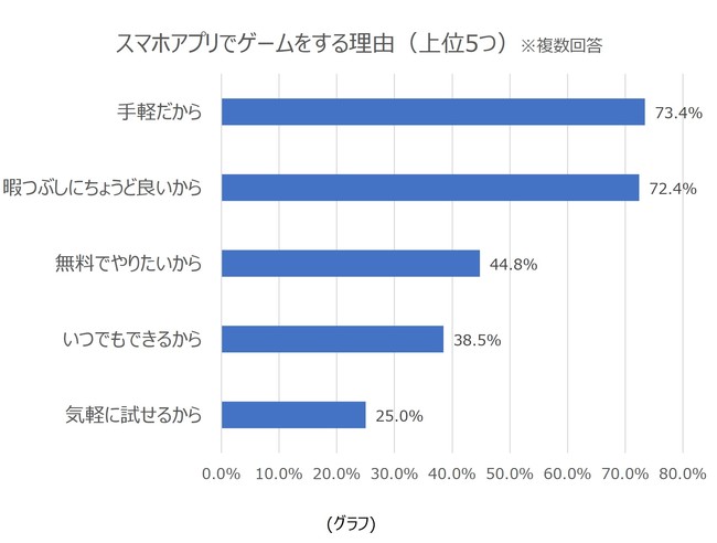 スマホアプリでゲームをする理由は「手軽だから」が73.4%と最も多く、次いで「暇つぶしにちょうど良いから」、「無料でやりたいから」と続きました(複数回答・グラフ)。