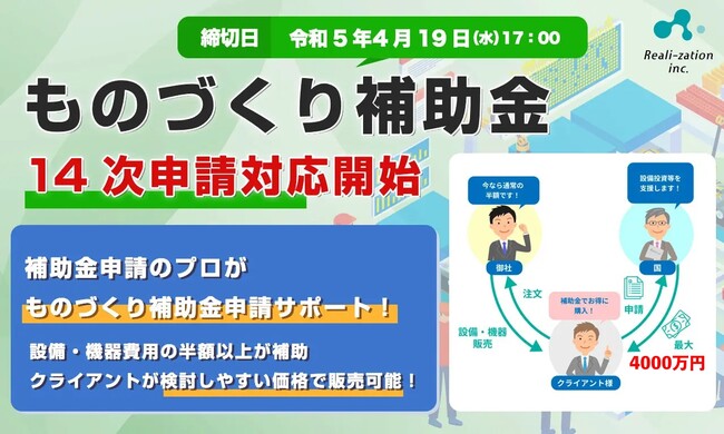 株式会社リアリゼイション(東京都渋谷区)は、「ものづくり補助金」を活用し、自社商材を拡販されたい方向けに、「ものづくり補助金」14次(締め切り:2023年4月19日(水) 17時)の申請代行サポートを開始しました。