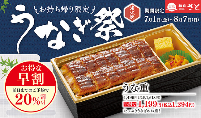 「和食さと」では、旬の食材【鰻(うなぎ)】を使用したテイクアウトキャンペーン「うなぎ祭」を、7月1日(金)から8月7日(日)までの期間限定で開催します。