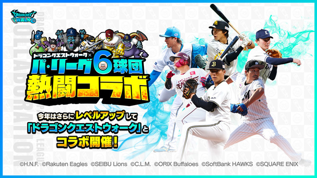 パシフィックリーグマーケティング株式会社(本社:東京都中央区、代表取締役CEO:根岸 友喜)とパ・リーグ6球団(北海道日本ハムファイターズ、東北楽天ゴールデンイーグルス、埼玉西武ライオンズ、千葉ロッテマリーンズ、オリックス・バファローズ、福岡ソフトバンクホークス)は、株式会社スクウェア・エニックス(本社:東京都新宿区、代表取締役社長:松田 洋祐)より配信中のスマートフォン向け位置情報RPG「ドラゴンクエストウォーク」とのコラボレーションを昨年に引き続き今年も開催することをご案内いたします。