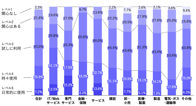 利用状況は業種によって大きく異なることも明らかになりました。レベル5の「日常的に使用」は、専門サービス(22.2%)、サービス(13.6%)、IT /Webサービス(12.5%)において1割を超えました。卸・小売も7.7%と平均を上回りました。一方で製造(2.8%)や建設(0%)、電気・ガス・運輸等(0%)において日常的な本格利用が後れている実態も明らかとなりました。