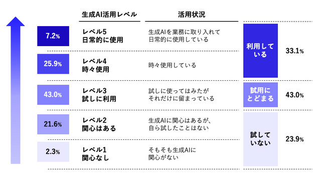 一方で、レベル1とレベル2を合わせた「試していない」層も2割強います。生成AIの活用を推進するためには、興味を持ってもらったり、試用できる環境を提供したりすることなどで、より上のレベルに引き上げていく方策が必要と考えられます。