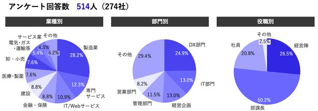 今回のアンケートは「生成系AIがもたらす3つの経営インパクト」のセミナーに参加した514人、274社を対象に実施されました。業種別では製造が最も多く導入に向けた関心が高く、専門サービスが続きます。部門別ではDX部門が最も多く、それに次ぐITや経営企画部門以外にも、管理や営業部門など幅広い業務において検討がされていることがうかがえます。部課長クラスが50%、経営層が25%強と、生成AIに対するマネジメント層の関心の高さも映し出しました。