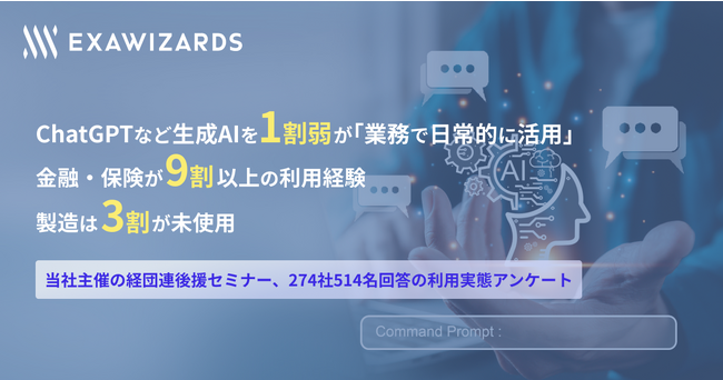 株式会社エクサウィザーズ(東京都港区、代表取締役社長:春田 真、以下、エクサウィザーズ)は、生成AIに関するセミナーの参加者を対象に利用実態のアンケートを実施いたしました。当社が日本経済団体連合会の後援を受けて2023年4月25日に実施したセミナーにおいて274社514名から回答を得て、生成AIを業務で日常的に活用する参加者は全体の7.2%と1割に近づいていることがわかりました。また業種別では、金融・保険において積極的に活用が進む一方、製造では様子見が多いなど、取り組みの差が大きいことが浮き彫りとなりました。