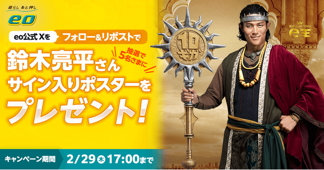 株式会社オプテージ(大阪市中央区)は、2024年1月27日(土)より、FTTHおよびエネルギーサービスを提供する「eo」において、鈴木亮平さんをイメージキャラクターとして引き続き起用し、『KING OF 10ギガ e王』をキーメッセージとしたテレビCMの放映を開始いたします。