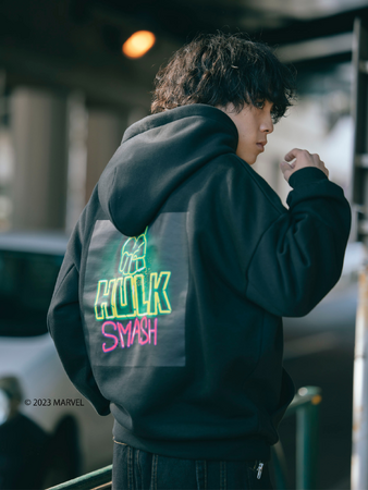 ネオン調のビッグプリントが目を惹く【ハルク】デザインのフーディー。