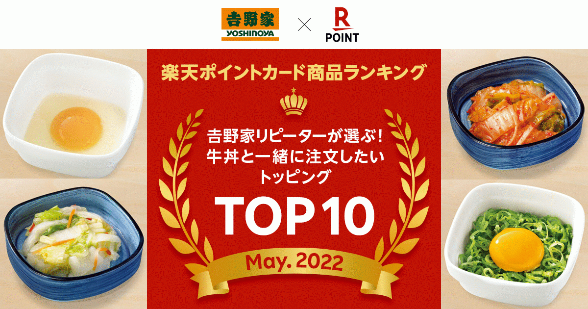 株式会社吉野家(本社:東京都中央区、代表取締役社長:河村 泰貴、以下 吉野家)と楽天ペイメント株式会社(本社:東京都港区、代表取締役社長:中村 晃一、以下 楽天ペイメント)は共同で、「楽天ポイントカード商品ランキング」において「吉野家リピーターが選ぶ!牛丼と一緒に注文したいトッピングTOP10!」を発表しました。