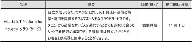 株式会社日立製作所(以下、日立)は、製造業や社会インフラ分野を中心とする企業向けに、DX(デジタルトランスフォーメーション)の構想策定から、迅速なデータ利活用基盤の設計・構築、セキュアな運用までをワンストップで支援する「Hitachi IoT Platform for industryクラウドサービス」を11月1日より提供開始します。