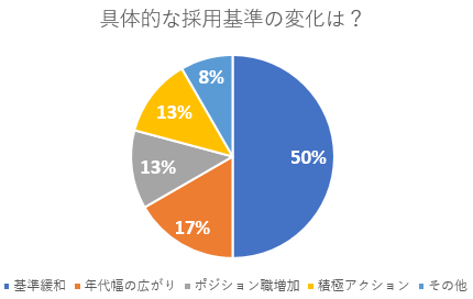 人材確保が困難であることを受けて「採用基準の変化を感じますか?」という質問に対して「はい」が6割以上を占めました。当社求人データ上では採用基準の変動はあまり見られないものの最前線では敏感に変化を感じ取っており、今後の動向とどのように連動するのか興味深い結果となりました。