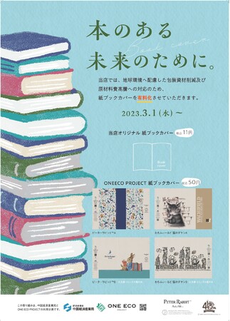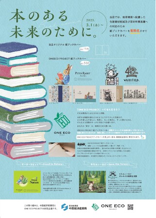 日本出版販売株式会社(代表取締役社長:奥村 景二、略称:日販)は、グループを挙げて推進するESGの取り組みの一環として、書店店頭にてエコ活動を企画、支援する「ONE ECO PROJECT」を実施しています。このたび、その活動の一環として中国経済産業局(局長:青木 朋人)と共同で、3月1日(水)より、全国の対象書店において、書籍やコミックの古紙をアップサイクルした、「ONE ECO PROJECT」和紙製ブックカバーを販売いたします。また、和紙製ブックカバー販売書店では、これまで無料配布していた紙製ブックカバーを有料化し、包装資材の削減にも取り組みます。